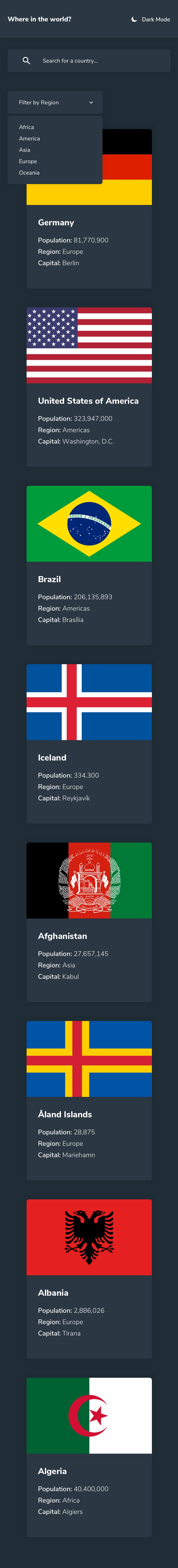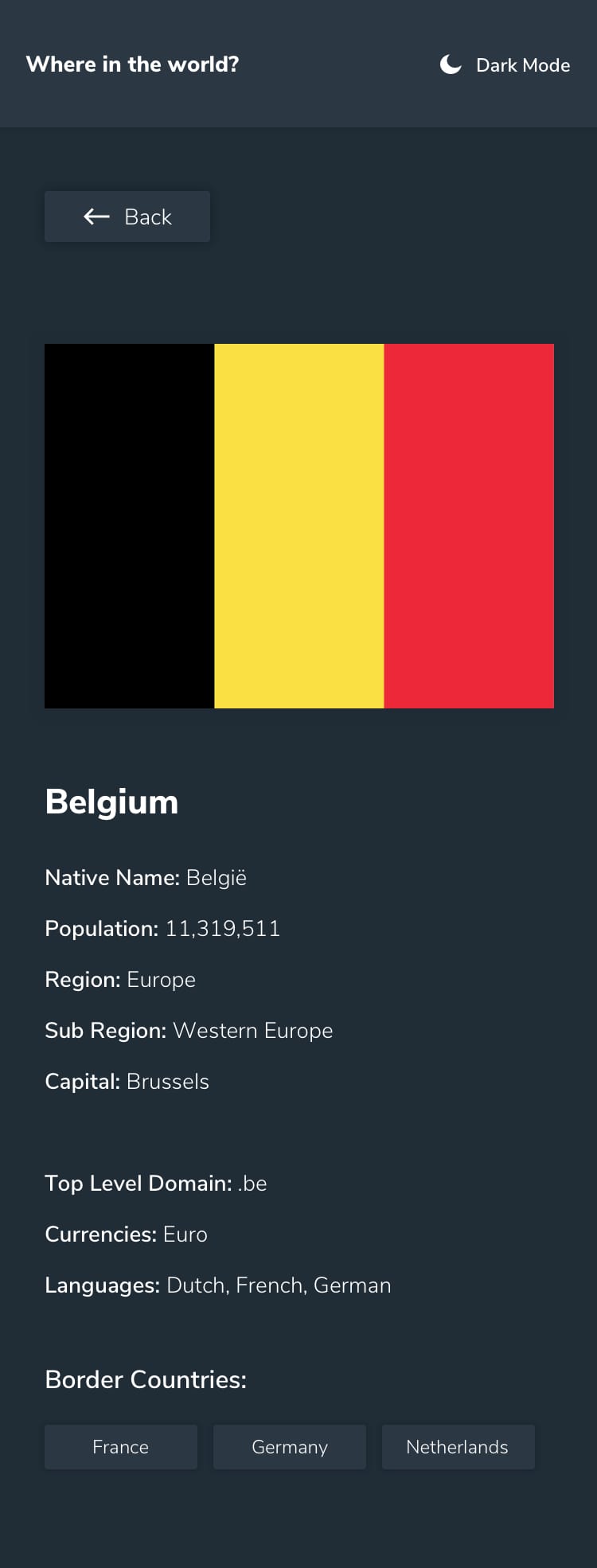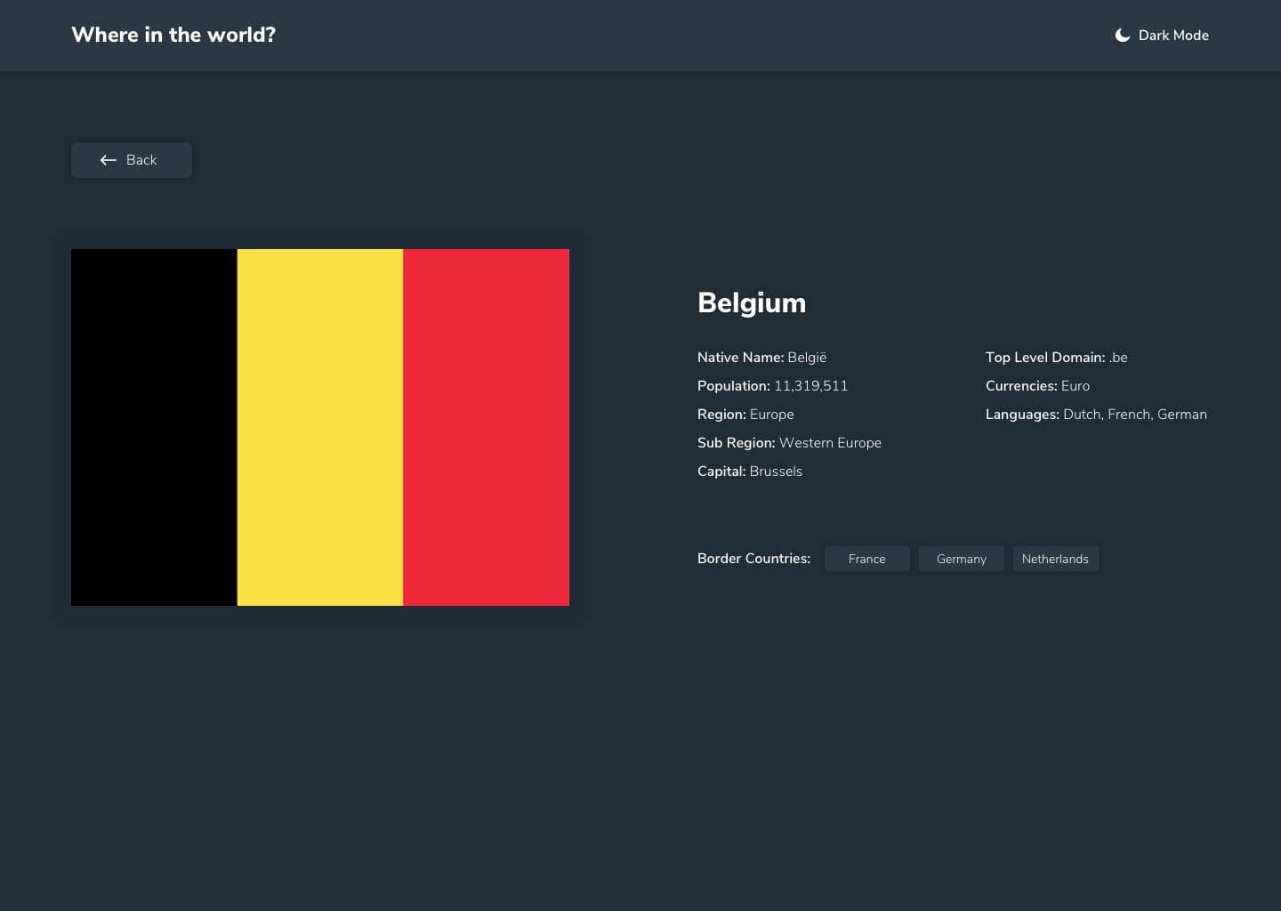 Your task is to build a project using the provided design files, integrate with the REST Countries V2 API to pull country data, and display it as demonstrated in the provided designs. You will find both a mobile and desktop version in light and dark mode color schemes for each page. Note that the final implementation doesn't have to be pixel perfect and anything close to the photos will suffice.