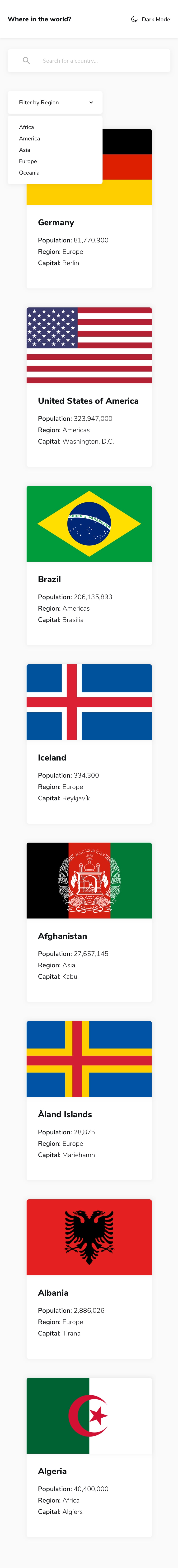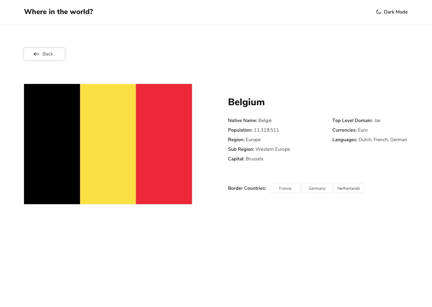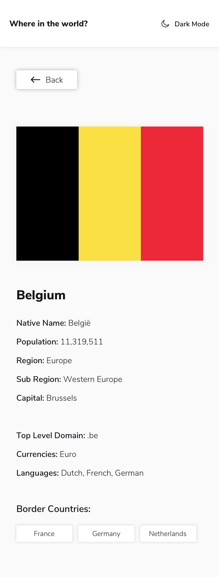 Your task is to build a project using the provided design files, integrate with the REST Countries V2 API to pull country data, and display it as demonstrated in the provided designs. You will find both a mobile and desktop version in light and dark mode color schemes for each page. Note that the final implementation doesn't have to be pixel perfect and anything close to the photos will suffice.